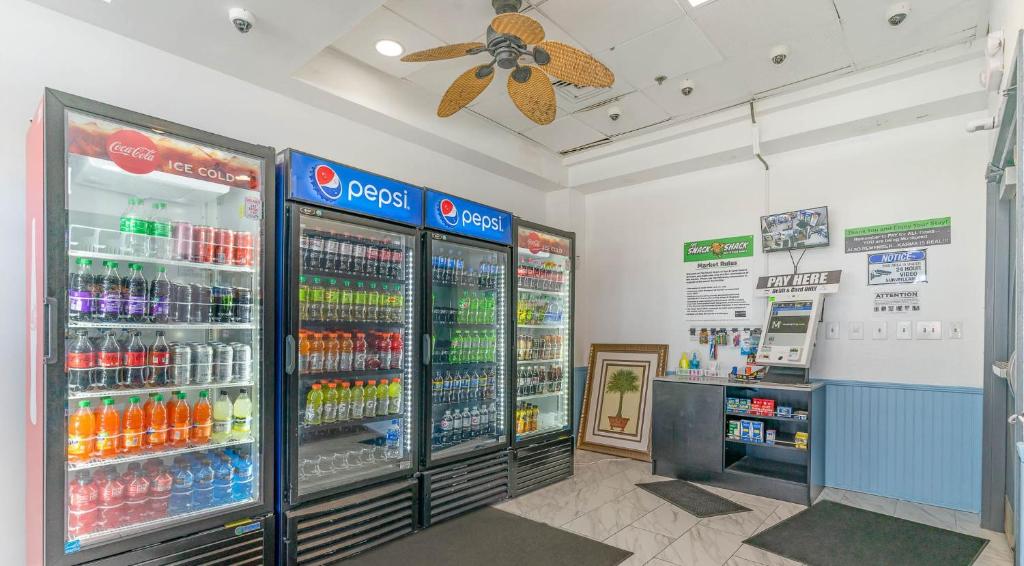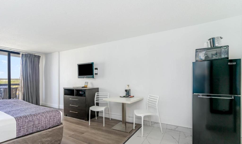 Varje rum har en egen balkong eller terrass där du kan ta in den friska havsluften och njuta av den fantastiska utsikten över Myrtle Beach. För din bekvämlighet finns det även ett kylskåp för att förvara dina snacks och drycker, samt en hårtork och gratis toalettartiklar för att säkerställa att du alltid ser ditt bästa ut. Med gratis snabbkaffe och fräscha handdukar tillgängliga, är allt du behöver för en avkopplande vistelse bara ett steg bort. Välkommen till Sun N Sand Resort - din perfekta tillflyktsort vid havet!